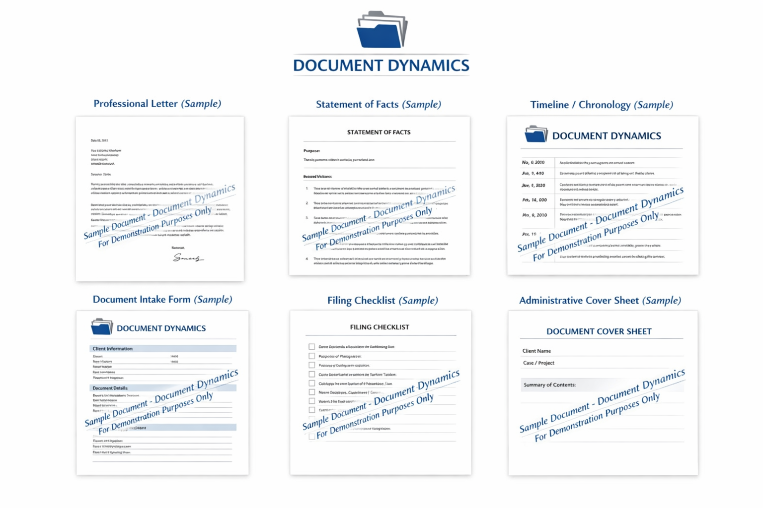 The samples shown represent common administrative formats. Document Dynamics also provides custom documents and templates based on individual client needs, including reusable templates and standardized document packages.